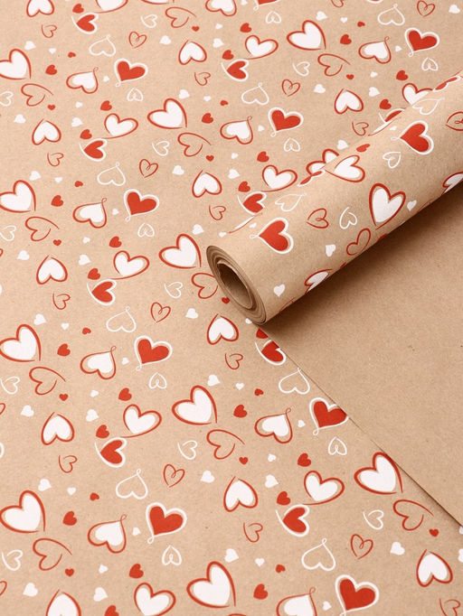 Бумага упаковочная крафт «Сердечки 2» красный/белый цвет на коричневом фоне 0.72×10±5% м, 60 г
