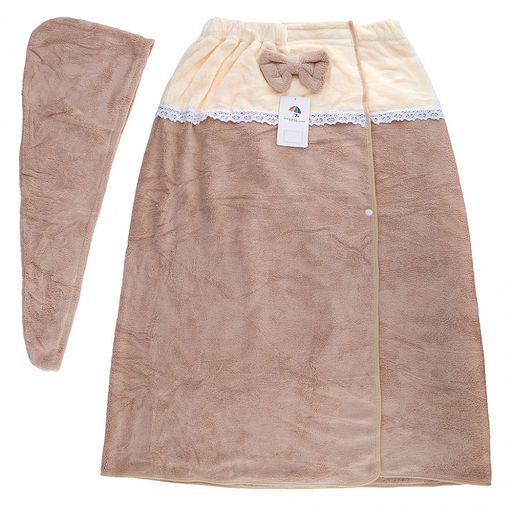 • Парео махровое "Куколка" 80х165см, хлопок 100%, на резинке с липучкой, на кнопке, ажурный кант; с чалмой на пуговице 68х25см, капучино (Китай)