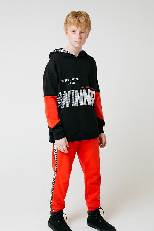 Брюки для мальчика из однотонного  футера петли. По бокам украшены декоративной лентой контрастного цвета с принтом. Внизу - эластичные манжеты.­