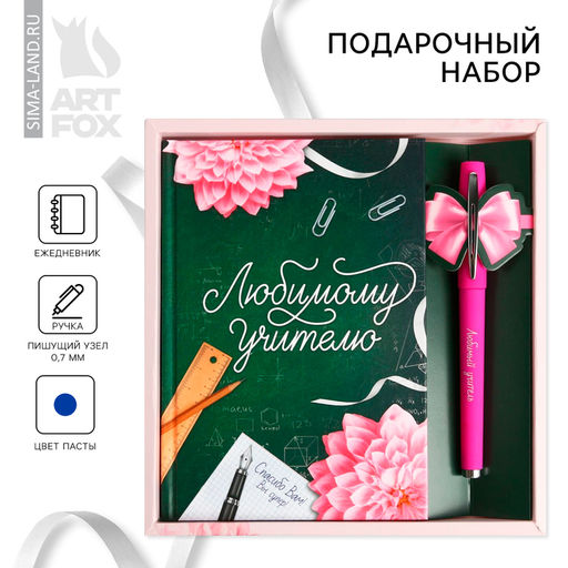 Подарочный набор торговой марки ArtFox, станет прекрасным подарком на любой праздник.Набор содержит 2 предмета:ЕжедневникКоличество: 1шт;Формат: А5;Количество листов: 80;Особенности: твердая обложка;Материал: бумага, картон.РучкаКоличество: 1 шт;Материал: пластик, чернила;Вид ручки: шариковая;Цвет стержня: синий;Упаковка: плёнка. Набор: Да. Для кого: Для женщины. Формат: А6. Европодвес: Нет. В наборе, шт.: 2. Вид упаковки: Коробка картонная. Тематика праздника: День учителя. Тематика праздника: 1 Сентября. Тематика праздника: Профессиональные праздники. Адресат: Учителю. Составляющие набора: Ежедневник. Составляющие набора: Ручка. Возраст: Для взрослых. Штрихкод на единице товара: Да. Бесплатная доставка: Да. Наша разработка: Да.
