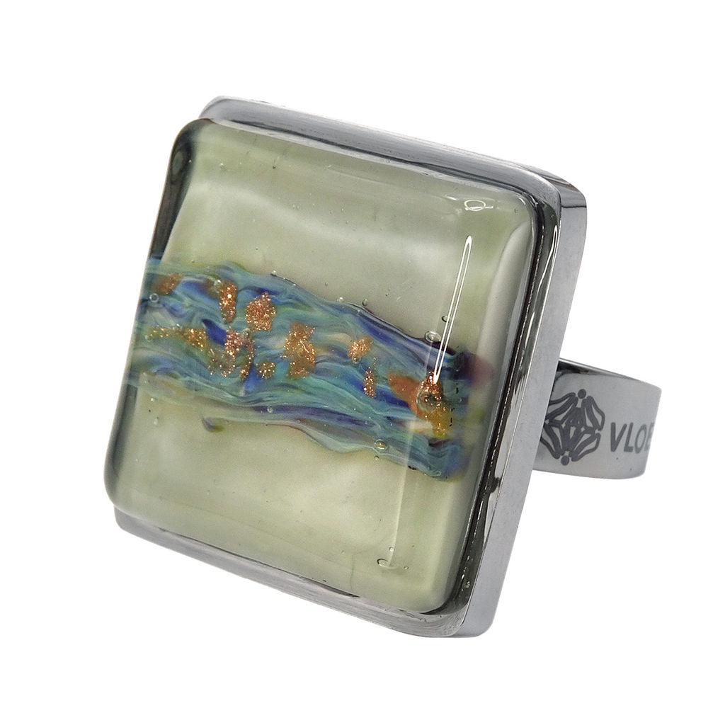 Кольцо изготовлено из муранского стекла и гипоаллергенной ювелирной стали, что очень важно для людей с чувствительной кожей. Металл не темнеет и не подвергается воздействиям окружающей среды, надолго обеспечивая красивый внешний вид изделия. Размер стеклянного элемента - 2.2*2.2 см. Кольцо безразмерное, регулируется с 16 до 19 размера. Вес - 11 гр.