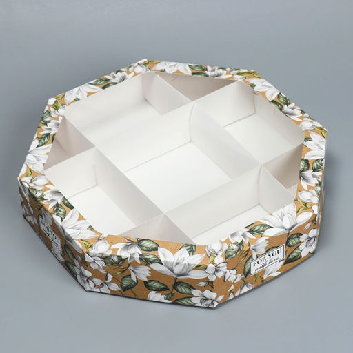 Размер центральной ячейки 11 х 11 см. Боковые 8 х 11 см. Треугольные ячейки в расширении 6 см. Вид упаковки: Универсальная. Вид упаковки: Для конфет. Форма: Восьмиугольная. Плотность, г/м: 280. Длина, см: 29. Ширина, см: 29. Высота, см: 5. Допустимый вес вложения, г: 300. Тематика: Цветочно-растительная. Тематика праздника: 8 Марта. Тематика праздника: 14 Февраля. Вид: Складные коробки. Бесплатная доставка: Да. Наша разработка: Да. Размеры товара: 29/5/29.