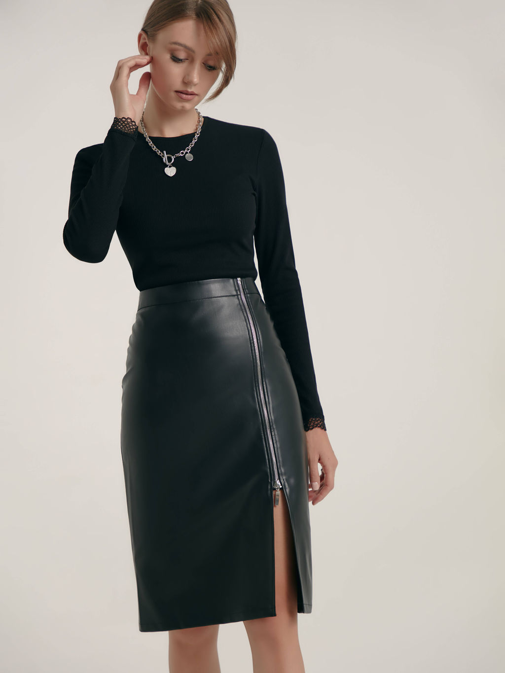 Юбка под кожу с разрезом и металлической молнией LU 1412 подчеркивает силуэт, визуально удлиняет ноги и делает талию заметно тоньше.