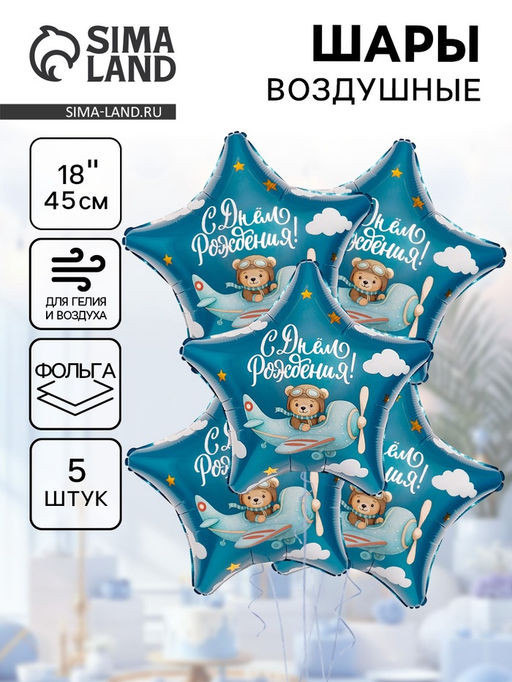 Воздушные шары фольгированные 19" «С днем рождения, пилот», 5 шт.