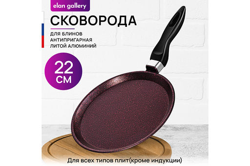 Сковорода блинная Elan Gallery "Гранат" из серии "Гармония вкуса" диаметром 22 см равномерно разогревается и распределяет тепло таким образом, чтобы продукты сохраняли все свои полезные и вкусовые свойства. Сковорода изготовлена из литого алюминия и имеет ультрапрочное двухслойное антипригарное покрытие Cookmark. Оно защищает блинчики от пригорания и позволяет переворачивать их лопаткой без особого труда. Диаметр дна 20 см. Выполнена в стильном дизайне. Покрытие устойчиво к царапинам и износу, полностью безопасно для здоровья и не содержит PFOA или других вредных веществ. Готовьте блины идеальной формы на завтрак и радуйте ими своих близких! Эксплуатация: не нагревать без продуктов. Дайте посуде остыть, прежде чем помещать ее в воду. Использовать только деревянные и силиконовые приборы. Не мыть абразивными или щелочными моющими средствами. Использовать в посудомоечной машине только в режиме "Эко" с применением средств, не содержащих щелочи. Подходит для всех типов плит, кроме индукционных. Блинница станет идеальным подарком на любой праздник и придаст процессу приготовления пищи новый уровень комфорта. Подарите универсальную кухонную утварь своим близким. Хорошая блинная сковородка мечта любой хозяйки! В серии "Гармония вкуса" вы найдёте любые кухонные принадлежности и инвентарь для вашего дома. Соберите набор для вашей кухни в едином стиле!