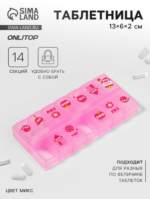 Безопасность в путешествии превыше всего. Таблетница сохранит необходимые лекарства, чтобы в важный момент вам не пришлось лихорадочно искать пилюлю в сумке или чемодане. Рассортируйте содержимое аптечки по отсекам и отправляйтесь в путь: всё самое нужное постоянно будет под рукой.Контейнер подходит для хранения различных мелочей не только в путешествии, но и дома.Размер таблетницы 13 × 6 × 2 см Набор: Нет. Длина, см: 13. Ширина, см: 6. Высота, см: 2. Количество секций: 14. Детские: Да. Вид упаковки: Пакет. Рисунок: Да. Назначение: Для косметики. Назначение: Для домашних мелочей. В подарочной упаковке: Нет. Бесплатная доставка: Да. Размеры товара: 6/2/13. Примечание: Цена указана за 1 штуку.. Примечание: Размер товара может отличаться от заявленного на +/- 0,5 см.. Примечание: Выбор конкретных цветов и моделей не предоставляется. На фотографиях могут быть представлены не все варианты..