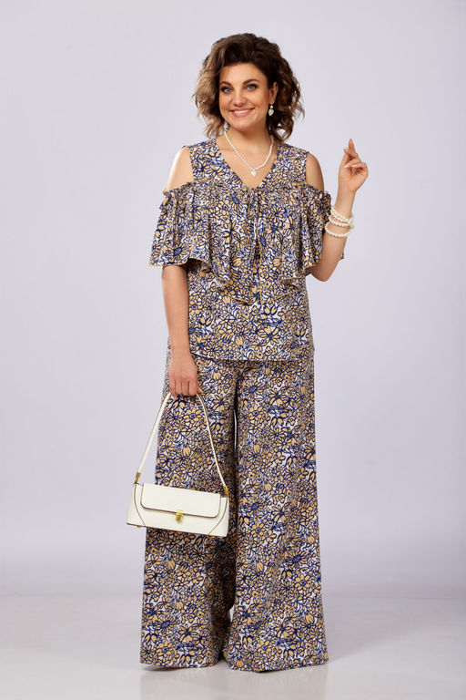 Состав: Вискоза-22%; ПЭ-73%; Спандекс-5%; Уникальный дизайнерский костюм, который станет любимой вещью вашего летнего гардероба. Выполнен из легкой струящейся ткани со стрейчем. Это костюм в котором вы всегда будете себя чувствовать уверенно. В нем легко и комфортно, можно носить куда угодно: на работу, в офис, на свидание, в ресторан, на прогулку. Каждую из вещей этого комплекта, легко можно сочетать с вещами из вашего гардероба. Оголенные плечики и в тоже время закрытые руки, придадут вам легкости и в тоже время элегантности. Брюки свободного силуэта на резинке, что обеспечит вам максимальный комфорт в легкость в ваших движениях. Отличительные черты приятная и очень легкая ткань, модный принт. Данный костюм будет лучшим приобретением на летний сезон. Длина по спинке -64см Длина брюк-113см Замеры 50-56: Блуза обхват груди 108 112 116 120 обхват талии 118 122 126 130 обхват бедер 122 126 130 134 Длина волана рукава 21 21 21 21 Длина по спинке 64 64 64 64 Брюки обхват талии резинка 72-108 76-112 80-116 84-120 обхват бедер 126 130 134 138 ширина по низу 44 44 44 44 длина брюк 113 113 113 113 -- Характеристики -- Состав: Вискоза-22%; ПЭ-73%; Спандекс-5%; Сезон: Лето Рост: 164 Страна бренда: Беларусь