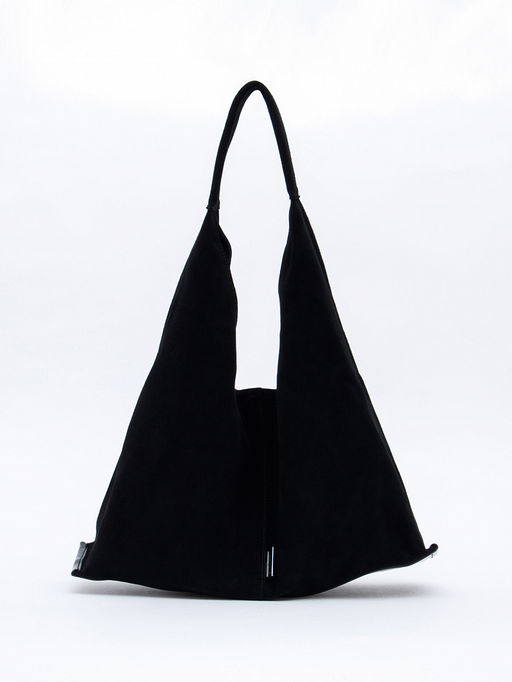 Вместительная сумка-хобо, выполнена из замши. Дополнена серебристой фурнитурой. Декорирована логотипом на передней части.  Данная модель закрывается на кнопку. Носится в руке или на плече за встроенную ручку. Каркас мягкий.