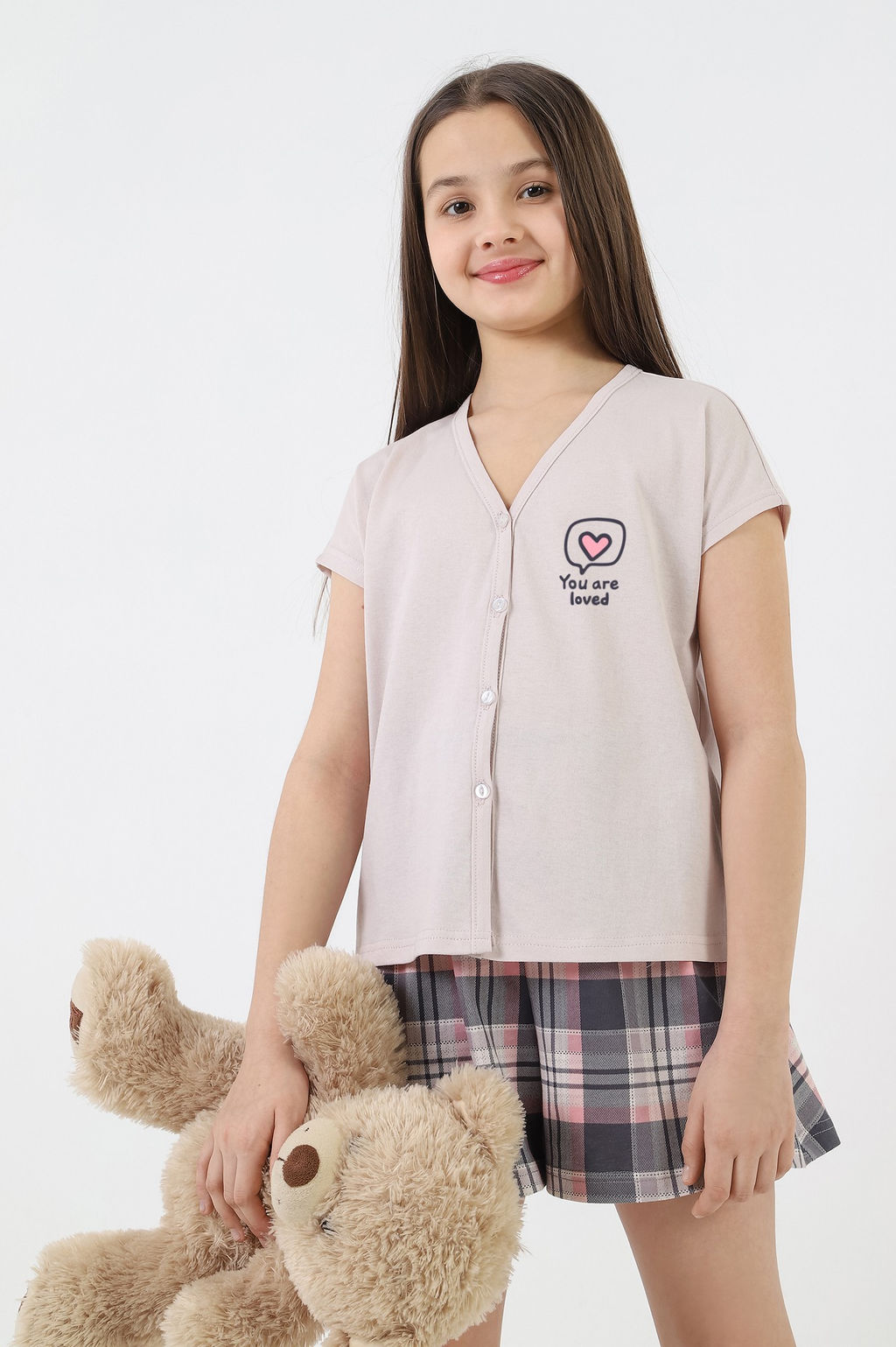 Пижама для девочки, состотящая из блузы и шорт. Блуза пижамная - из гладкокрашенного полотна "кулирка", свободжного покроя, с короткими цельнокроеными рукавами, V-образной горловиной и центральной бортовой застежкой на обметанные петли и пуговицы. В верпхней части левой полочки - принт, выполненный в технике шнлкографии. Борта и горловина окантованы основным материалом. Шорты - из полотна "кулирка" в клетку, расклешеные, короткие, с эластичной тесьмой по талии.­
