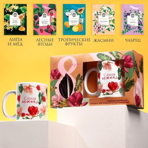 Подарочный набор С 8 Марта: чайное ассорти (5 вкусов x 4 шт.), кружка 300 мл.