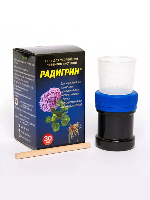Гель для укоренения черенков гортензии, пузыреплодника, ежевики, спиреи и других полуодревесневших черенков растений.