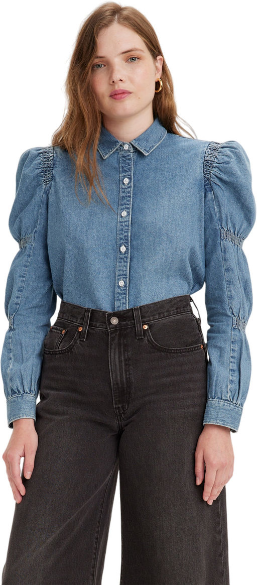 Джинсовая рубашка Levis Zuma Cinched Slv романтичного кроя. Заостренный воротник. Пышные длинные рукава со сборками и мажетами на пуговицах. Закругленный подол. Отлично сочетается с жилетами. Заправьте рубашку в любимые джинсы или носите поверх них - непринужденный романтичный образ вам обеспечен.