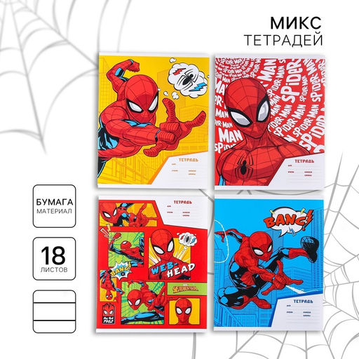 • Цена за 20 шт. Тетрадь 18 листов, в линейку, МИКС 4 видов, обложка мелованная бумага, «Человек-паук»