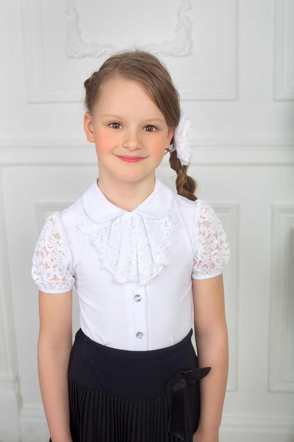Изделие изготовлено из эластичного трикотажного полотна в деловом стиле.Отложной воротничок и  съемное "жабо" делают блузку нарядной .Предназначена для школы.­
