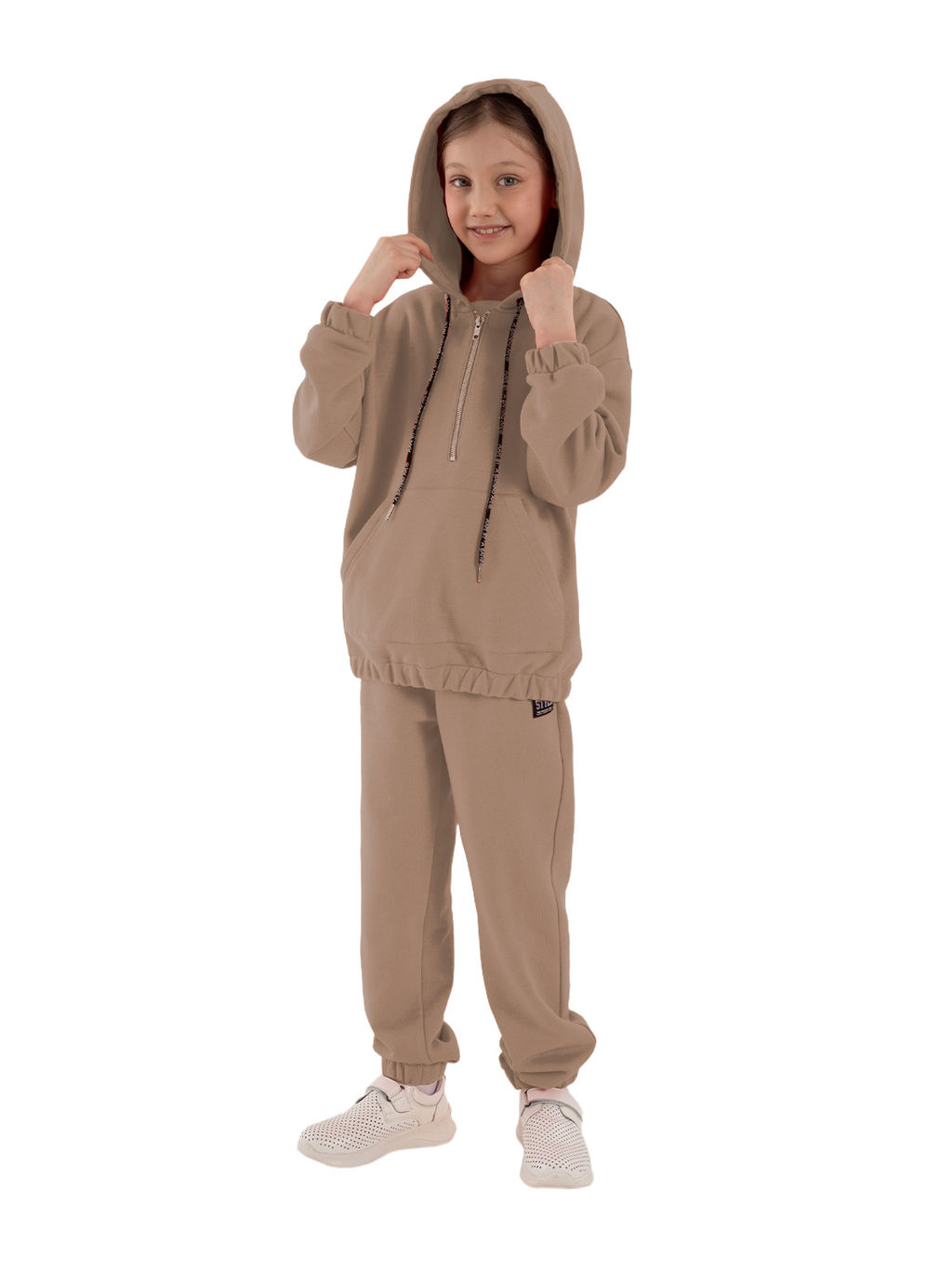 Джемпер из плотного трикотажа с капюшоном со шнурком, спущенное плечо, длинные рукава, по низу рукавов эластичная лента, на полочке застежка молния, подрез, большой карман, по низу изделия внутренняя эластичная лента.