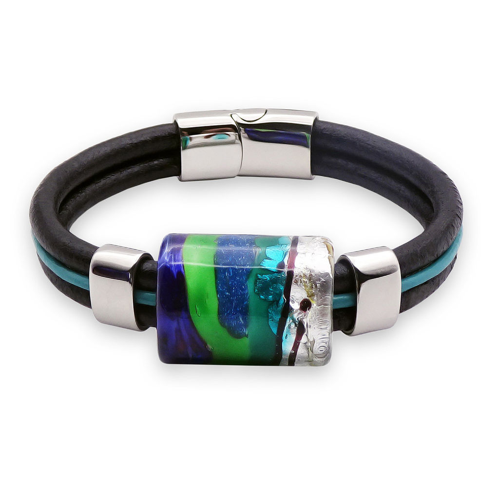 Браслет изготовлен из муранского стекла, натуральной кожи и гипоаллергенной ювелирной стали, что очень важно для людей с чувствительной кожей. Металл не темнеет и не подвергается воздействиям окружающей среды, надолго обеспечивая красивый внешний вид изделия. Крепкий магнитный замок с двойной защитой надежно фиксируется на запястье. Ширина браслета - 1,5 см. Размер стеклянной бусины - 1,9x2,5 см. Вес - 30 гр.