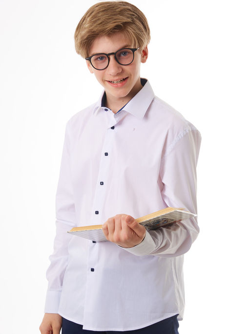 Классическая белая сорочка на кнопках подойдет в школу, на праздник и на выпускной. Модель полуприлегающего силуэта с длинным рукавом и контрастным темно-синим внутренним воротником-стойкой. Сорочка выполнена из качественной ткани с высоким содержанием вискозы, что позволяет вашему ребенку чувствовать себя комфортно. Сорочка идеальна для гардероба как часть школьной формы, она идеально сочетается с классическими брюками. Широкий размерный ряд позволяет подобрать сорочку как для детей школьного возраста, так и для подростков. Стильная сорочка станет модной вещью в гардеробе вашего сына. Состав:65% полиэстер, 35% вискоза