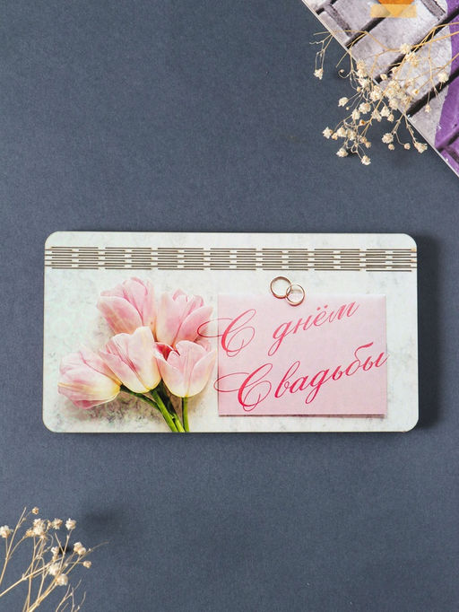 Купюрница свадебная "С днём свадьбы" розовые тюльпаны, 19х9,5х0,7 см, вид 1