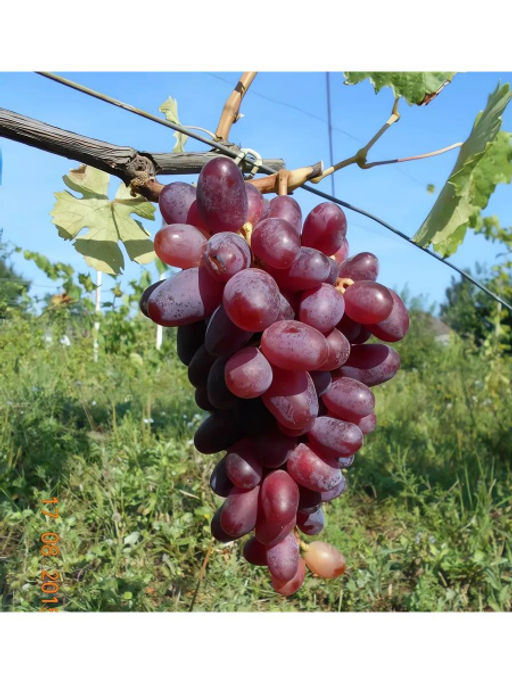 Куст отличается большой силой роста, на побегах образуются по 23 соцветия, листья средние, фигурной формы. Срок созревания ранний, первыми ягодами можно полакомиться через 100105 дней после распускания почек. Грозди имеют коническую форму, по плотности рыхлые, их вес достигает 11,5 кг. Горошение не характерно для сорта. Ягоды тёмно-фиолетовые с бордовым оттенком, удлинённо-овальные, вес 812 г. Мякоть плодов плотная, хрустящая. Вкус приятный, гармоничный. У перезревших плодов медовый привкус, связанный с высокой сахаристостью.
