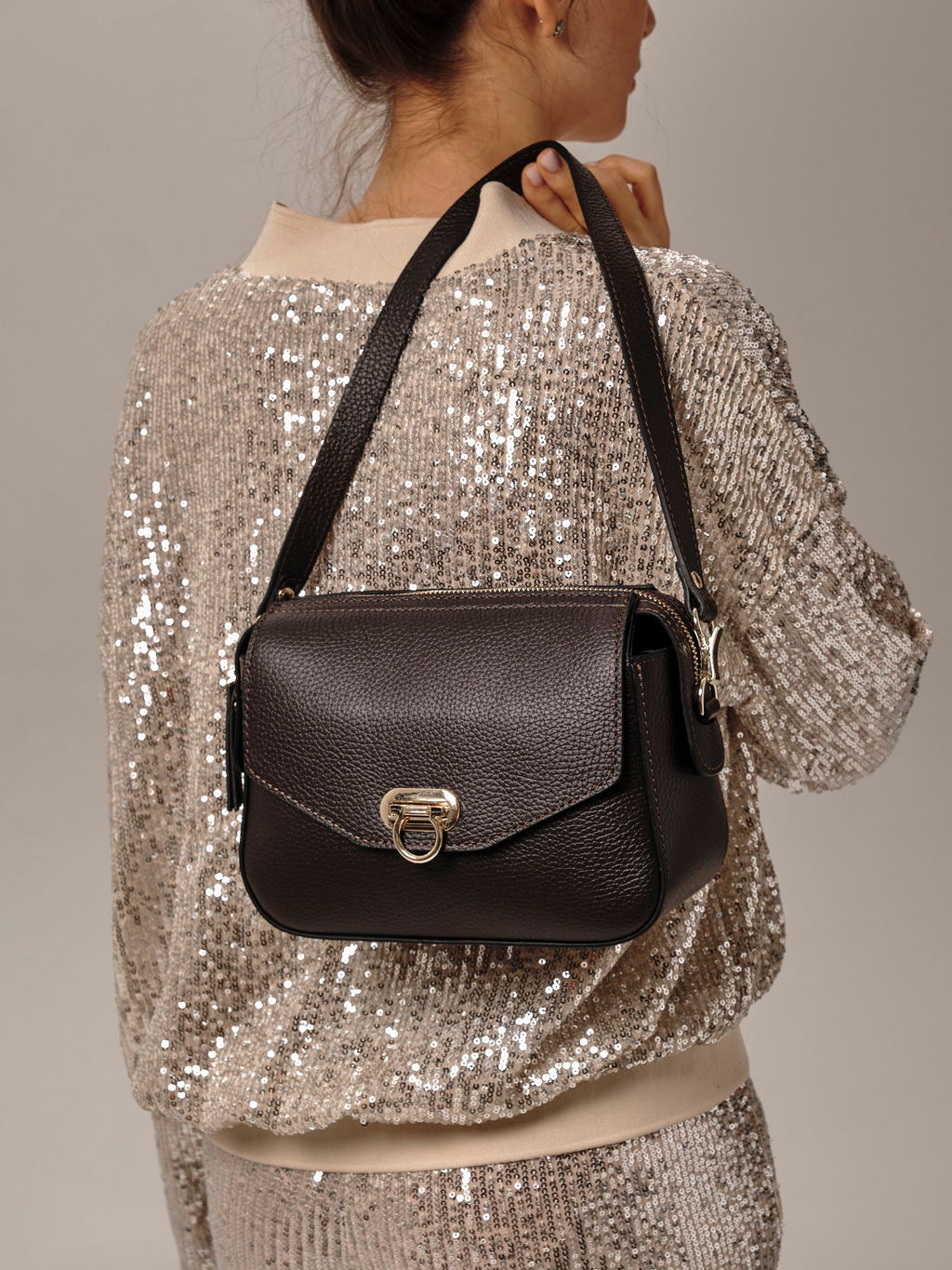 Форма сумки лаконичная и аккуратная, что делает её универсальной для любых образов - от повседневного до более элегантного. Темно-коричневый цвет всегда актуален: он подчеркивает фактуру кожи и легко сочетается с любой одеждой.
