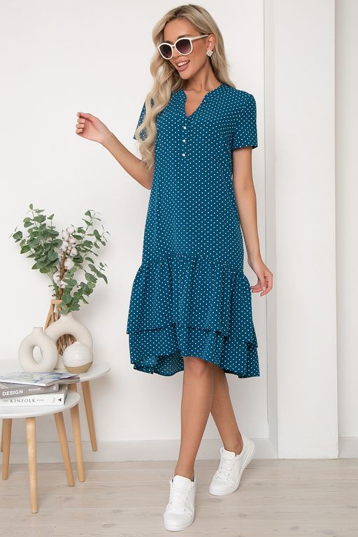 Состав: 95% ПЭ, 5% эластан. Длина изделия: 108 см. Романтичное платье из плательной ткани. Модель с фигурной планкой по переду, застежка по центру на пуговицы. Короткие втачные рукава. Платье дополнено двойным воланом.