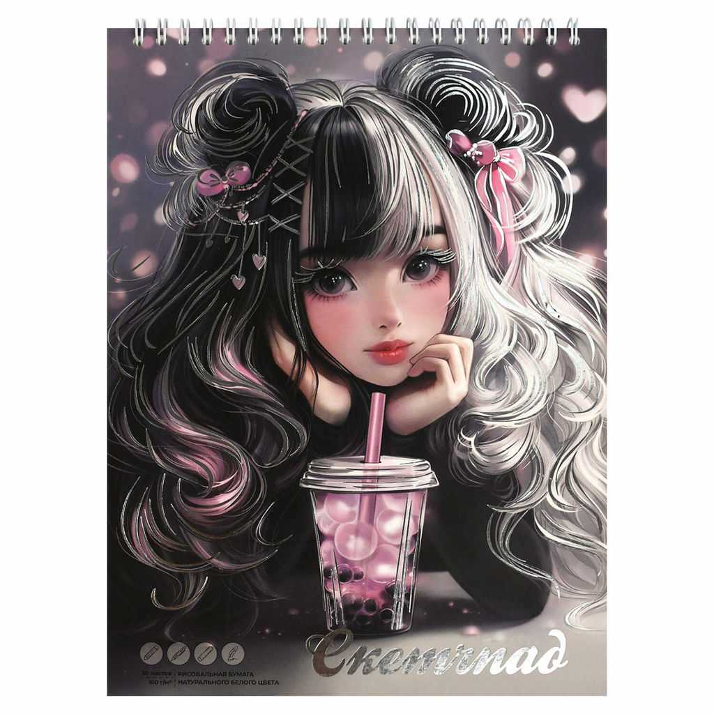 Скетчпад 185х250 мм, 30 л, блок - рисовальная бумага 160 г/м?, арт. 70036 ДЕВОЧКА С БАБЛ-ТИ /обложка полноцветная печать, гребень по короткой стороне, матовая ламинация, тиснение фольгой/