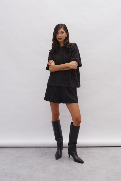 Джемпер прямого свободного кроя выполнен из фактурного плотного полотна с геометрическим абстрактным принтом. Образ дополнит юбка артикул А317, шорты артикул А322.