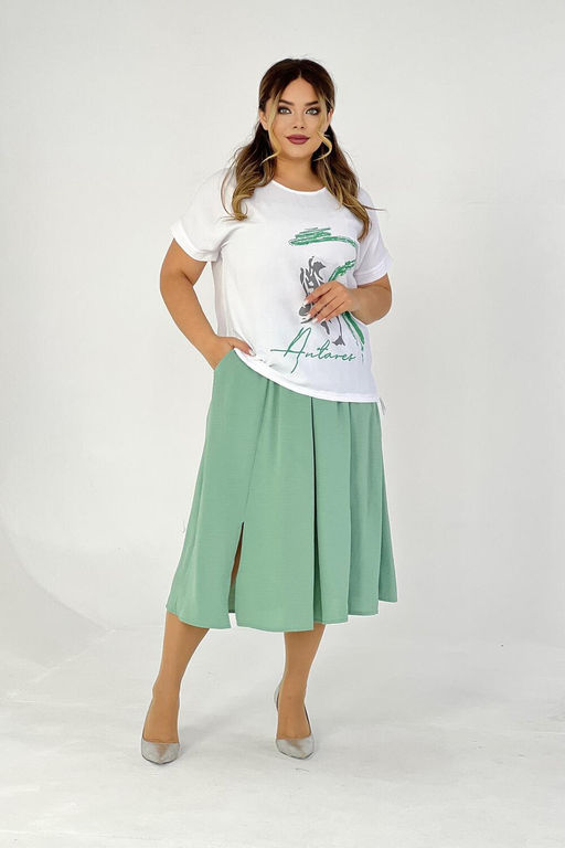 Женская двойка прямого силуэта. Верх комплекта в белом цвете с цветным принтом, короткий цельнокроеный рукав, низ футболки имеет свойство затягиваться, поэтому ее можно носить спущенную на юбку, а можно затянуть и оставить над ней, что подчеркнет вашу талию. Низ - свободная юбка двух цветов, с двумя разрезами снизу. Костюм повседневный и удобный, из легкой ткани сингапур, что хорошо для жаркого лета.