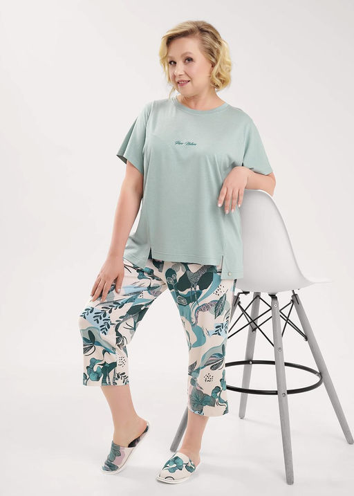 Пижама из трикотажного полотна с модалом. Джемпер по горловине и борту обтачка с застежкой на пуговицы, накладные карманы, нашивка металл. Короткий втачной рукав. Боковые разрезы. Брюки с поясом на внутренней резинке. Боковые карманы с отрезным бочком. Состав: