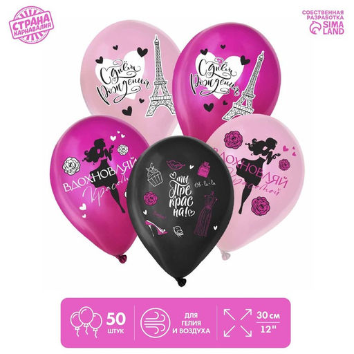 • Воздушные шары латексные 12" «С ДР. Париж», 50 шт.