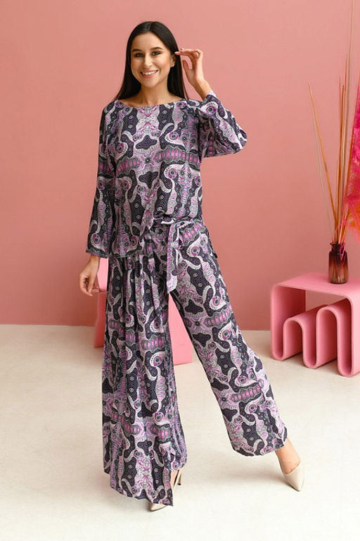Комплект из туники и брюк с запахом, из принтованной вискозы. Туника средней длины прямого силуэта, рукав реглан. Горловина обработана обтачкой. Вырез горловины лодочка на полочке и V-образный на спинке. Удлиненная деталь спинки. Разрезы в боковых швах. Брюки с запахом, свободного силуэта. Отлетная деталь(юбка) на поясе - завязке. Пояс на эластичной тесьме.­