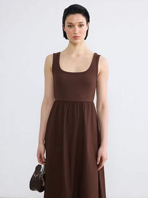 Kare Yaka B?zg?l? Belden Oturtmal? Elbise