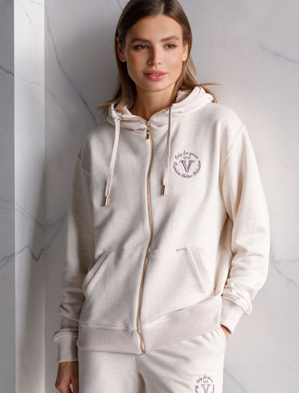 Худи на молнии с золотистой фурнитурой выполнено из премиального футера трехнитки без начеса. Изделие украсили принтом в виде логотипа бренда. Мягкий и уютный трикотаж с добавлением эластана гарантирует абсолютный комфорт даже в прохладное время года, не ограничивая свободу движений. Модель сочетается в костюме с брюками D44.079 и D44.089­