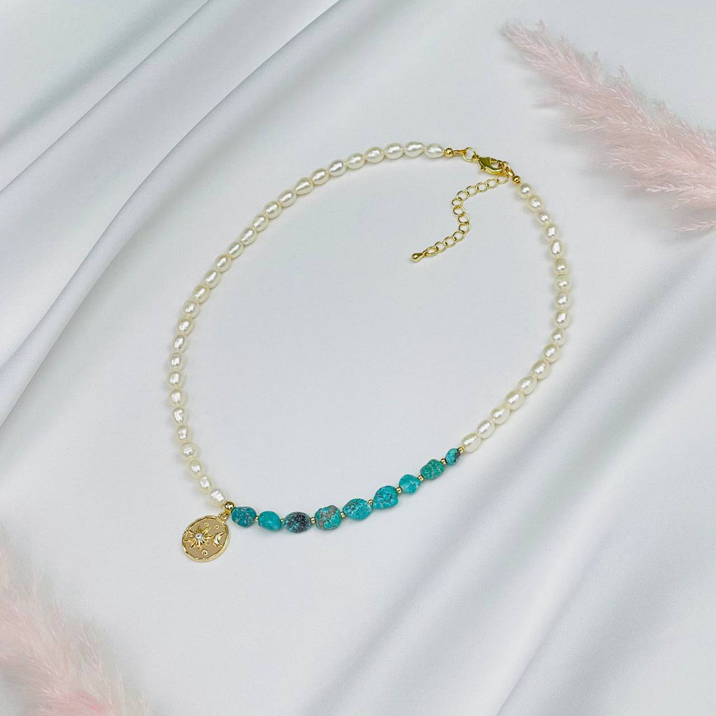 Колье из Жемчуга и Бирюзы с подвеской 45 см +
