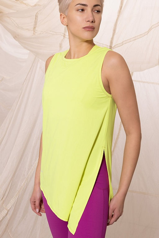 Женская майка-туника из спортивной коллекции Opium Fitness. Солнечный яркий цвет обеспечит превосходное настроение в любую погоду. Трикотажная ткань из вискозы подарит прохладу и нежные тактильные ощущения. А-силуэт скроет проблемные места. Туника имеет ассиметричный крой подола, который образует диагональ. С длинной боковой стороны высокий разрез. Свободные концы подола можно завязать узлом сбоку, а можно оставить как есть.­
