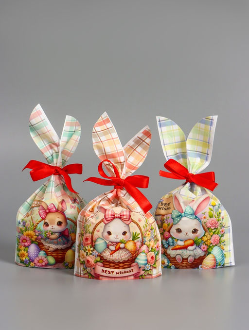 * Декоративные ушки вместо ручки: Фигурный верх пакета с характерными ушками делает его похожим на зайчика или праздничный мешочек. Такой дизайн нравится детям и добавляет упаковке игривости.