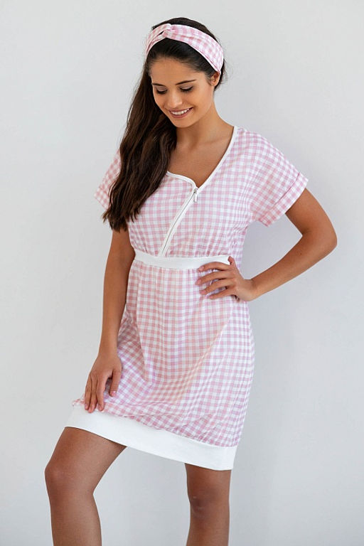 Ночная рубашка Annika, идеальна как для беременных, так и во время грудного вскармливания. Модель изготовлена из высококачественного хлопка. Вырез с застежкой-молнией, которая облегчит кормление. Все дополняется нежным узором в бело-розовую клетку.­