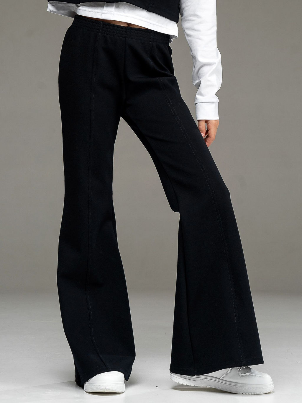 Стильные брюки-клеш из джерси черного цвета для девочки, облегающие по бедрам и расклешенные от колена. Спереди по центру - рельефный шов. Пояс на эластичной резинке.