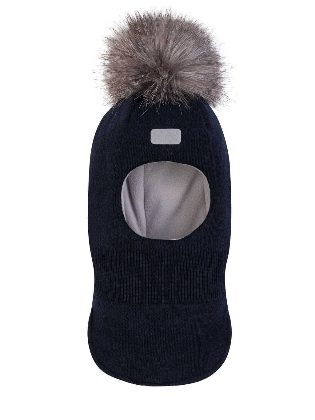 Детская зимняя утепленная вязаная шапка-шлем однотонного темно-синего цвета с удлиненной задней частью. В составе шерсть мериноса и акрил. Утеплитель синтепон 100гр и флисовая подкладка. Сверху большой помпон из искусственного меха. Низ обработан оверлоком. Спереди небольшая нашивка.