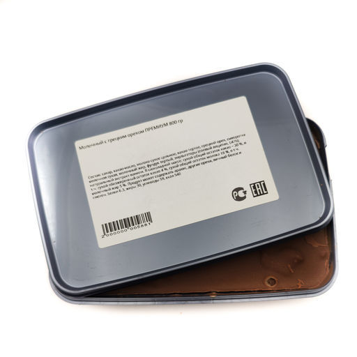 Состав: сахар, какао-масло, молоко сухое цельное, какао тертое, грецкий орех, сыворотка молочная сухая, молочный жир, фундук тертый, эмульгаторы (соевый лецитин, E476), натуральный экстракт ванили. В шоколадной массе: сухой общий остаток какао 30 %, в т.ч. сухой обезжиренный остаток какао 4 %, сухой общий остаток молока 18 %, в т.ч. молочный жир 5 %. Продукт может содержать арахис, другие орехи, яичный белок и глютен. Белки 6.3, жиры 30, углеводы 59, ккал 540