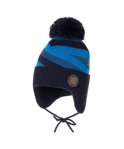 Особенности модели:- Оригинальный вязаный узор в полоску;- Удобные завязки для фиксации шапки;- Помпон из нитей;- Ветрозащитные вставки в области ушей.