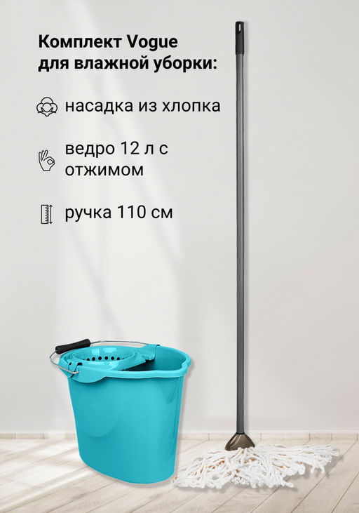 Швабра с ведром Spin&Clean из коллекции Vogue с насадкой из 100% органического хлопка - поможет с легкостью создать идеальную чистоту в доме за считанные минуты. Швабру МОП можно использовать для мытья полов, стен, потолков и других поверхностей. Прочная металлическая ручка 110 см позволит не наклоняться при уборке. Насадка Spin&Clean из хлопка тщательно удаляет загрязнения с поверхности, насухо вытирает не оставляя разводов. Чтобы не мочить руки при уборке швабру можно прополоскать в ведре Spin&Clean Vogue и потом отжать насухо, используя съемный отжим. Ведро объемом 12 л из прочного безопасного пластика подходит для использования горячей воды и бытовых моющих средств. Со временем оно не выцветает и не тускнеет. Для выливания воды на ведре предусмотрен носик. Эргономичная ручка с пластиковой рукояткой оптимально распределяет нагрузку при переноске ведра. Стильный набор для уборки полов Spin&Clean Vogue можно компактно хранить, разместив отжим и швабру в ведре.