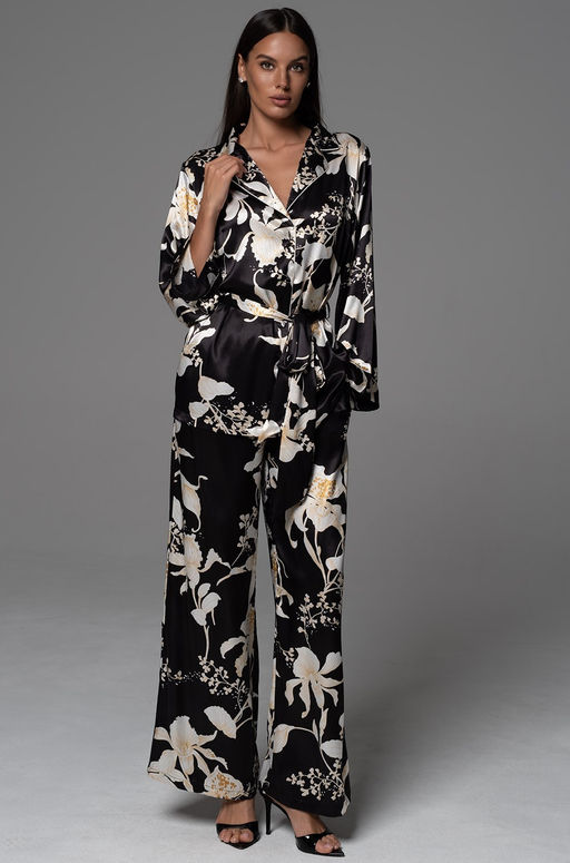 Комплект Mia-Amore состоит жакета с застежкой на пуговицы и брюк-палаццо. Комплект выполнен из принтованного смесового шёлка. Брюки с эластичным поясом и с боковыми карманами. Жакет декорирован кантиком и комплектуется поясом. Состав:70% натуральный шелк, 25% полиэстер, 5% эластан