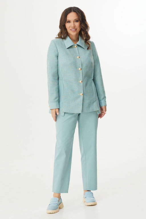 Стильный и элегантный комплект из жакета и брюк. Жакет прямого кроя, на подкладке, с центральной застежкой на пришивные пуговицы. Выполнен из джинсовой ткани в сочетании с рогожкой. Рукав втачной, снизу дополнен притачной манжетой с застежкой на пришивную пуговицу.  Воротник отложной.  По талии скрытая кулиска с фиксаторами. Брюки свободного кроя, слегка заужены книзу. Посадка средняя. Пояс притачной, дополнен эластичной тесьмой. Брюки дополнены удобными боковыми карманами.  Застежка гульфик на молнию  и металлическую пуговицу. Брюки выполнены из джинсовой ткани средней плотности. Длина жакета от плечевого шва 75см. Длина рукава 60см. Длина брюк по боковому шву 98 см.­