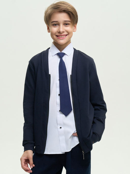 Кардиган для мальчика из трикотажного полотна футер-петля с длинными втачными рукавами,прямого силуэта, горловина V-образная. Застежка на планке на молнию. На полочке декоративный элемент. Рукава на манжете, низ на планке.