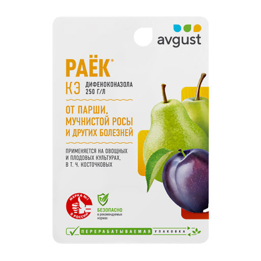 Описание товара Благодаря системному действию средство быстро проникает в ткани растений, в которых зимовали возбудители болезней. Раёк может не только предотвратить размножение патогена, но и ослабить заражение, если первые симптомы уже проявились. Уже через 2 часа после использования препарат не смывается дождем, что очень важно весной, когда проводится первая обработка. Всего необходимо 4 обработки за сезон.