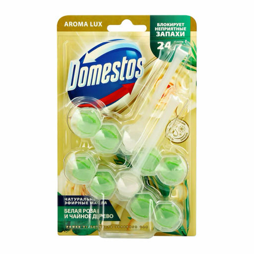 Попробуйте сменный блок для очищения туалета Domestos Power 5 Duo Свежесть зеленого чая против известкового налета и неприятного запаха, помогающий обеспечить защиту от загрязнений и микробов. При каждом смывании появляется яркий аромат белой розы и масла чайного дерева на срок до 4 часов и обильная пена, которая борется с налетом, поддерживая гигиену и блеск поверхности унитаза.Блок для унитаза Domestos содержит активное вещество, которое под действием напора воды защищает от бактерий и помогает бороться с появлением известкового налета. Средство наполняет комнату ярким ароматом, который помогает предотвращать неприятные запахи и остается до 4 часов после смывания.Как использовать туалетный блок? Вскройте пластиковую упаковку, достаньте шарики для унитаза Доместос, поместите под ободок туалета в место наиболее сильного потока воды с помощью держателя. После использования туалетного блока для унитаза Domestos Power 5 Duo Свежесть зеленого чая выбросите его в мусорное ведро. Внешний вид товара может отличаться от представленного изображения