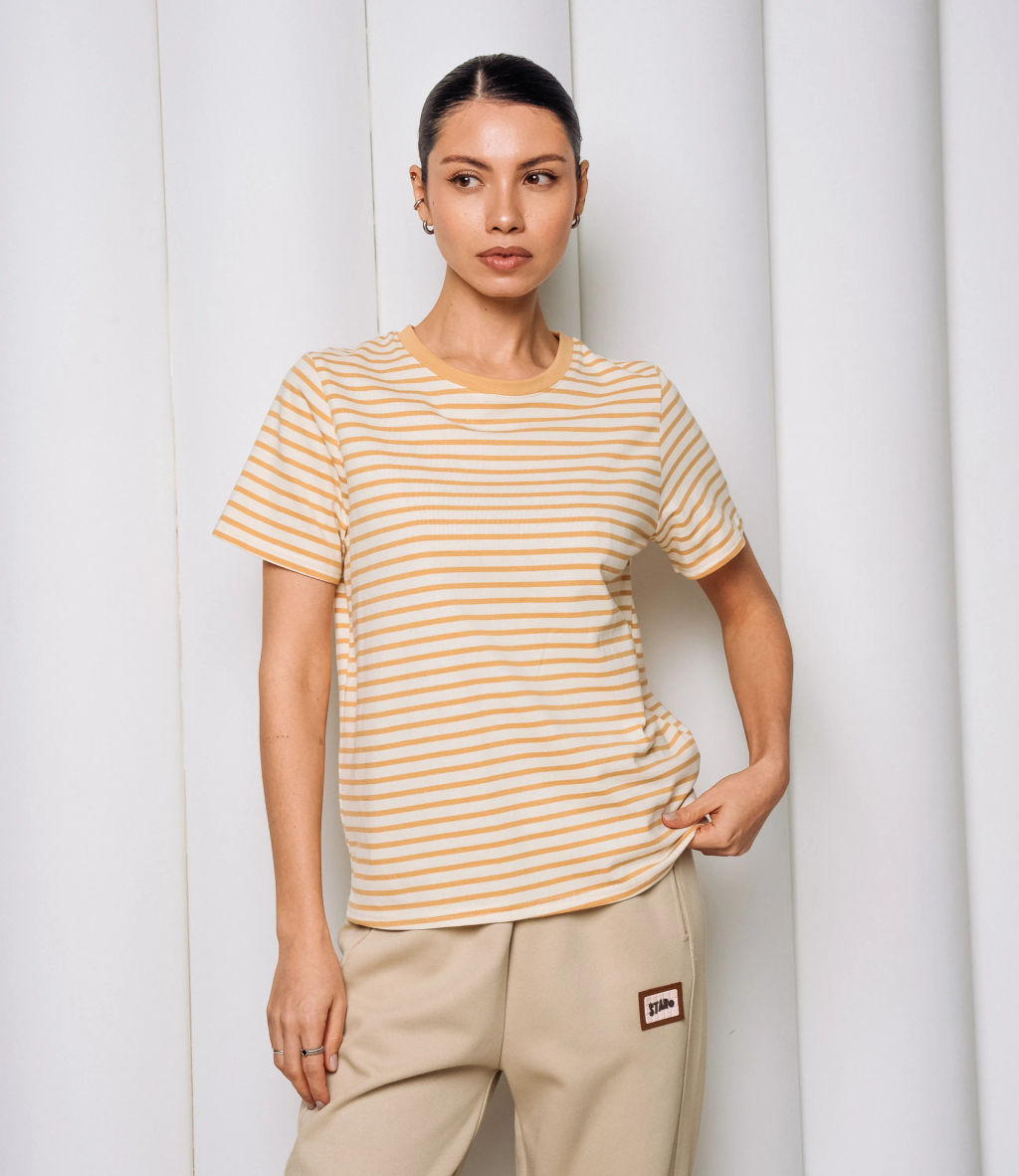 Эта футболка прекрасный выбор для вашего магазина, предлагая стильный и универсальный дизайн, который станет отличным дополнением к гардеробу ваших клиентов. Эта модель представлена в классическом полосатом узоре, сочетая нейтральные и приглушенные тона, что делает её универсальной. Футболка с традиционным круглым вырезом и короткими рукавами, свободного кроя, что обеспечивает свободу движений и комфорт. Идеально подходит для сочетания с джинсами, шортами или брюками, а также может быть использована как базовый элемент для создания многослойных образов. Выполненная из ткани с 95% хлопка и 5% полиэстер, футболка обеспечивает отличное качество и приятные тактильные ощущения. Независимо от сезона, она станет любимым элементом в гардеробе ваших клиентов. На странице сайта доступна таблица размеров, что позволит вашим покупателям легко найти подходящий вариант. Установленная цена делает эту футболку доступной для широкой аудитории, что обеспечит вам высокий уровень продаж. Рост модели: 164, параметры: 83-61-89. -- Характеристики -- Цвет: карамель Пол: Женский Страна производитель: Китай Сезон: Всесезонный Материал: Хлопок, Полиэстер