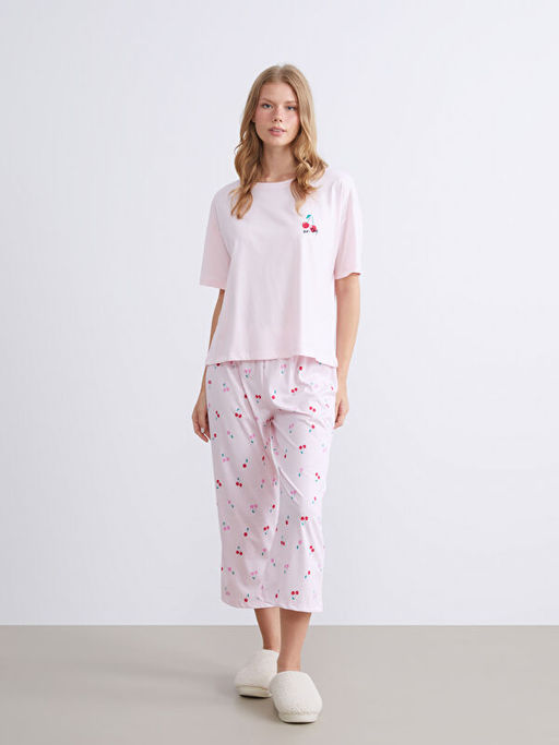 Bisiklet Yaka Bask?l? Kad?n Kaprili Pijama Tak?m?