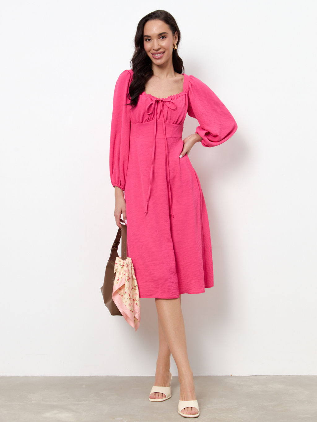 Платье приталенного силуэта, расширенное книзу из ткани с крэш-эффектом. Отрезное по линии талии. Верхняя часть с отрезным лифом, подрез фигурный. По верхнему краю лифа кулиска, в которую вставлены бретели-завязки, формирующие драпировку. Вырез горловины глубокий, расширенный, по форме напоминающий каре, с вырезом до линии подреза. Прилегание платья создано за счет рельефов на деталях переда и вытачек на деталях верхней и нижней части спинки. В верхней части среднего шва спинки застежка на потайную молнию. Рукава втачные, длинные, со сборкой по окату и низу рукава. В подгибку низа рукава вставлена резинка.
